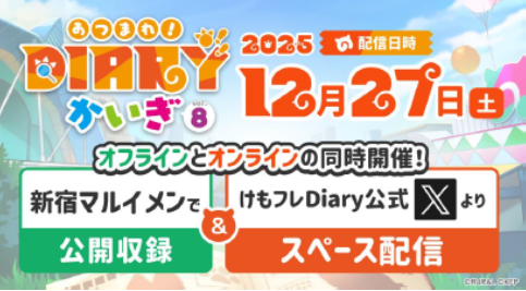 12月27日からのイベント期間中、会場にて「あつまれ!Diaryかいぎ Vol.8 公開生放送参加権付きステッカー (税込4,000円)」を購入した方のみ公開生放送にご参加いただけます。